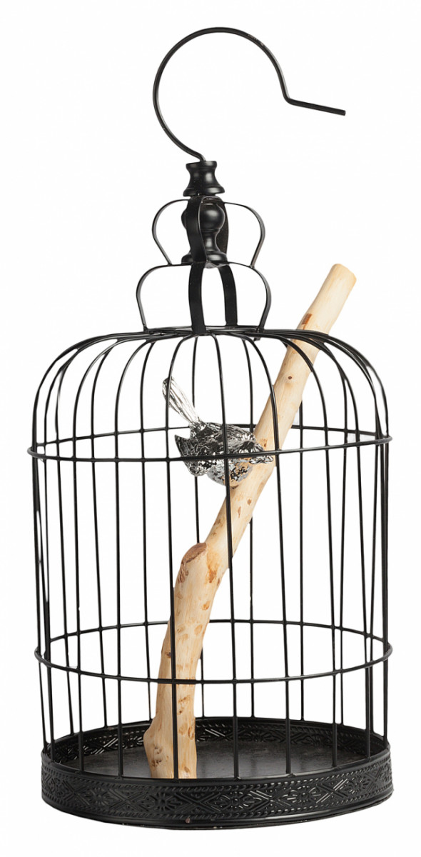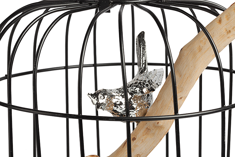 Клетка, как элемент декора, может украсить пространство сада загородного дома. Клетка выполнена из металла в чёрном цвете, с декоративной птицей серебристого цвета. Приобрести можно с другими предметами украшений для сада.