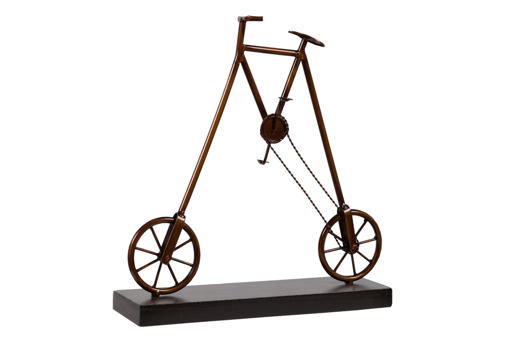 Элемент декора Rucota, выполненный в виде старинного велосипеда из металла в бронзовом цвете, размещённый на постаменте, заставит порадоваться любителей старинных вещей, и вам захочется купить этот оригинальный элемент декора, либо подарить близким людям.