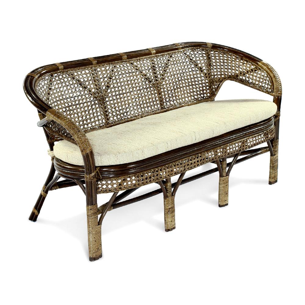 Диван из ротанга с ажурным плетением из кофейного комплекта Пеланги. Настоящая классика плетеной мебели из ротанга. Диван не разборный. Диван укомплектован подушкой из плотной ткани рогожка. Чехол на подушке съемный. Сиденье выполнено сплошным плетением ротанговой коры, что позволяет использовать диван без подушки.