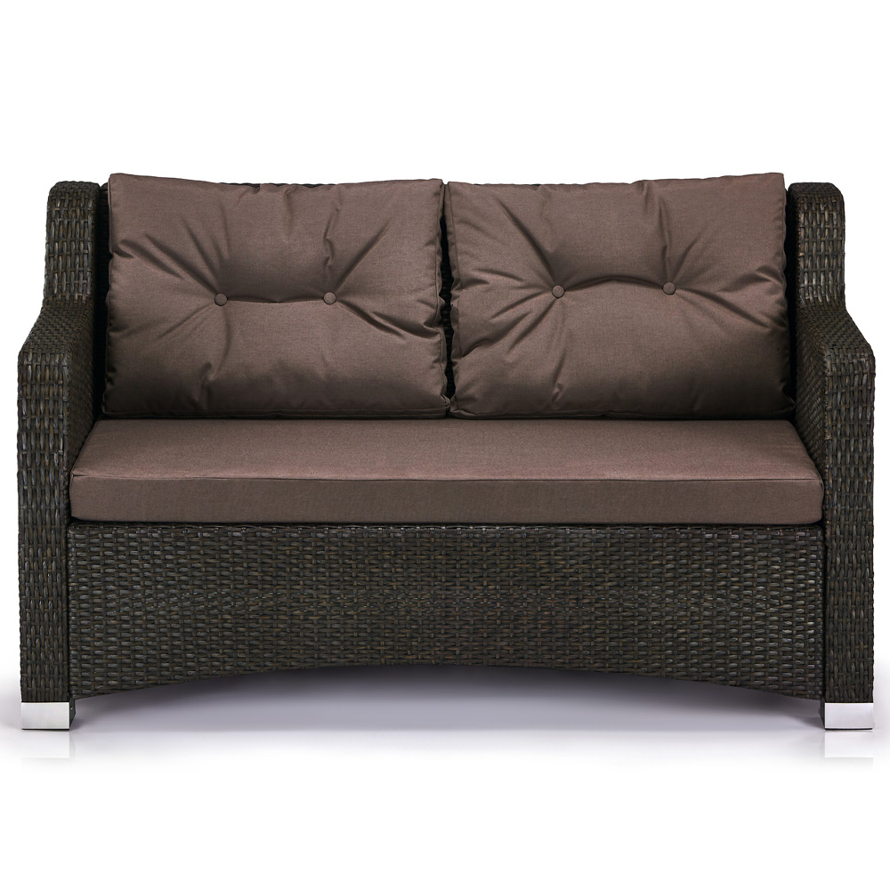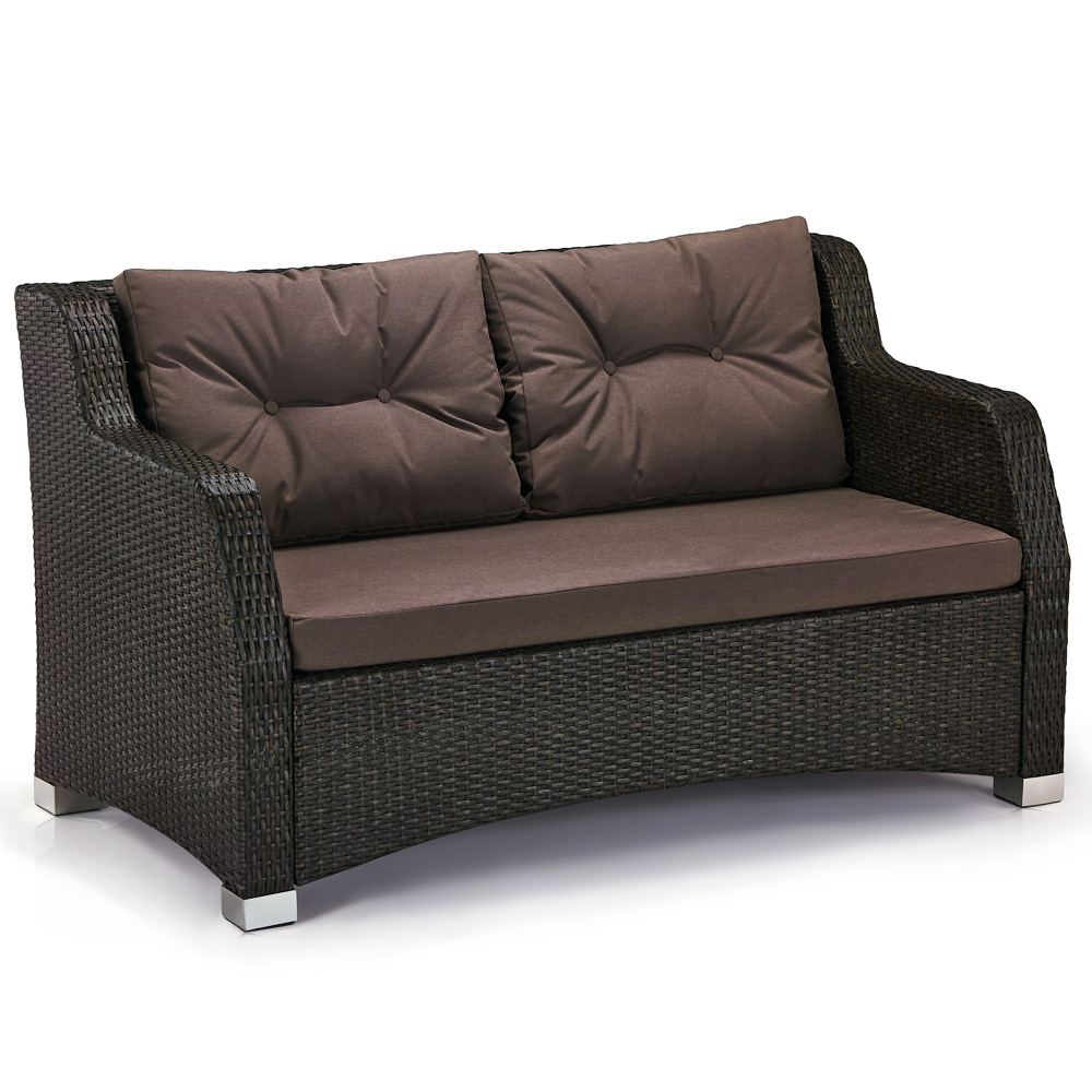 Диван: W150xD82xH85см. Каркас: труба сталь D25.Материал: искусственный ротанг. Подушки в комплекте. Цвет: Brown.
