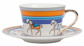 Этот комплект для чаепития станет идеальным подарком для любителя горячих ароматных напитков благодаря исключительному качеству костяного фарфора и великолепному художественному исполнению декоративных рисунков. Отдельного внимания заслуживает позолоченная ручка чашки с тонкой изящной формой. Рисунок исполнен в современном стиле и придется по сердцу любой хозяйке дома. В нашем интернет-магазине вы также можете купить комплекты тарелок в этом же стиле.