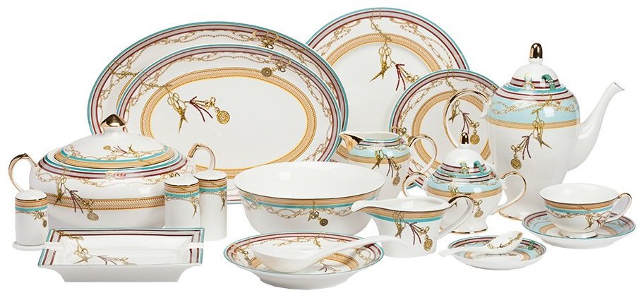 Состав: Тарелка диаметром 30,5 см - 6 шт., тарелка диаметром 25,5 см - 6 шт., тарелка диаметром 20 см - 6 шт., суповая тарелка диаметром 20 см - 6 шт., чайная пара - 6 шт., кофейник - 1 шт., сахарница - 1 шт., молочник - 1 шт., подставка для зубочисток - 1 шт., пепельница - 1 шт., овальное блюдо диаметром 30,5 см - 1 шт., овальное блюдо диаметром 35,5 см - 1 шт., супница - 1 шт., поварешка - 1 шт., миска диаметром 11,5 см - 6 шт., салатница диаметром 20,5 см - 1 шт., ложка маленькая - 6 шт., соусница - 1 шт., тарелка под пирожные диаметром 10 см - 6 шт., солонка - 1 шт., перечница - 1 шт.