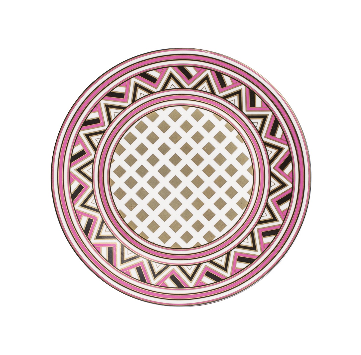 Блюдо Eclectic II из грубой керамики с трехцветным геометрическим орнаментом. Края блюда декорированы геометрическим орнаментом в сиреневых тонах в виде треугольников. В центре блюда изображены квадраты в приглушённых тонах. Это блюдо в комбинации с тарелками Eclectic II, представленными в нашем интернет-магазине, создадут уникальную сервировку стола.
