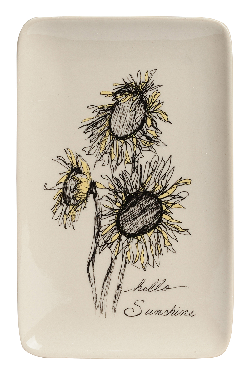 Дом можно декорировать не только настенными панно или статуэтками. Можно украшать интерьер изящной необычной посудой. Для этого прекрасно подойдет декоративное блюдо Sunflower. Изображения цветов остаются наиболее распространенными украшениями интерьеров. Блюдо выполнено из грубой керамики белого цвета. Сама тарелка простой прямоугольной формы отличается рисунком трех подсолнухов. Это блюдо может украсить интерьер, а также обеденный стол. Тарелку можно даже просто поставить вертикально или повесить на стену — такой милый рисунок не должен остаться незамеченным! Тем не менее практичная сторона вопроса имеет место быть — удобное углубление отлично подойдет для фруктов и овощей. Или для чего-то ещё. Блюдо можно использовать даже для кулинарных экспериментов: оно выдерживает достаточную температуру микроволновой печи. А также есть возможность мыть тарелку в посудомоечной машине. Блюдо может стать приятным подарком для каждого.