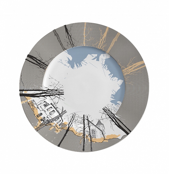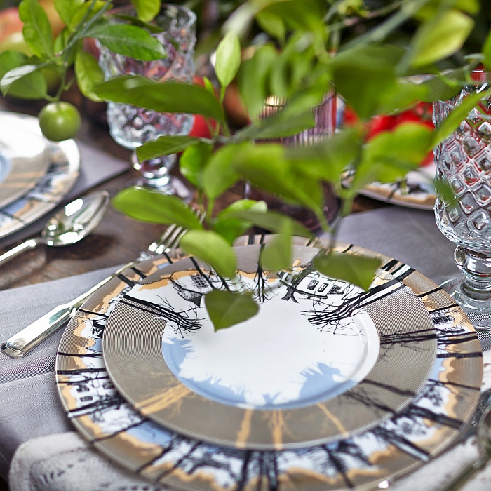 Коллекция состоит из сервировочного блюда, столовой и десертной тарелок.