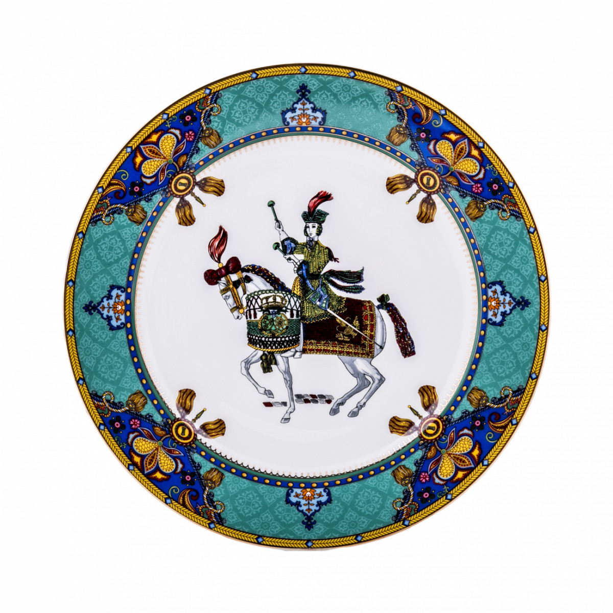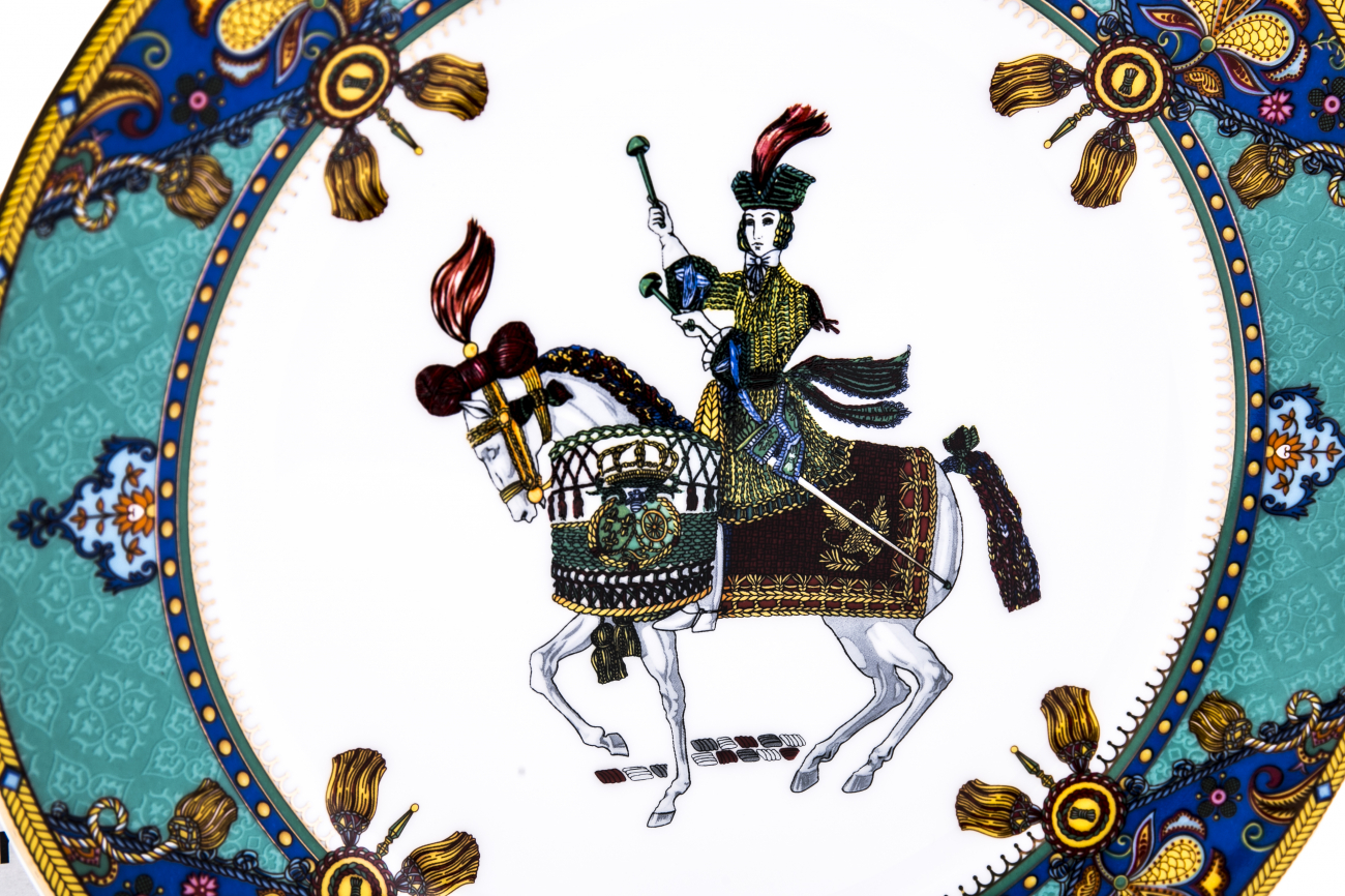 Тарелка Jinete выполнена из костяного фарфора. Тарелка расписана ярким орнаментом по всему краю, с элементами геральдической символики. На дне тарелки изображена воинственная наездница.
