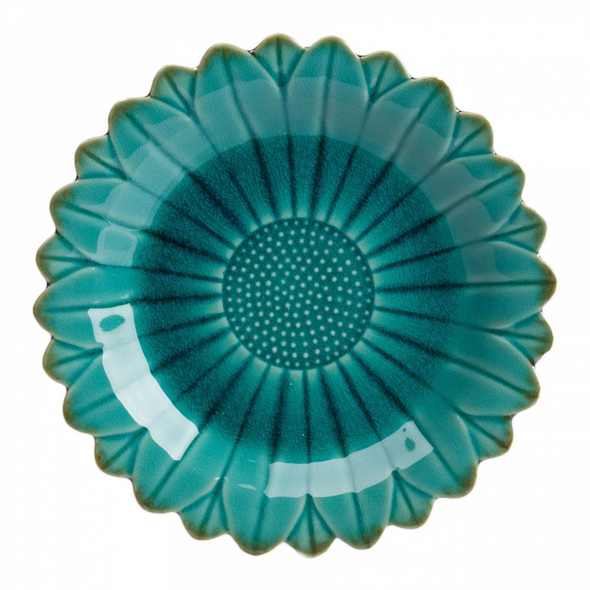Тарелка Sunflower Grande изготовлена в цвете аквамарин, из грубой керамики в виде цветка, хорошо просматриваются лепестки, от чего край тарелки - рифленый. Дно тарелки украшено лепестками, в виде рельефных точек. Тарелку можно приобрести отдельно или в дополнение к другим предметам серии.