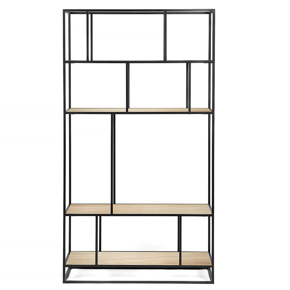Стеллаж Makella black с стальным каркасом, покрытым черной полимерной краской, которая защищает изделие от износа, имеет стойкость к влаге, солнцу и механическому воздействию. Полки же исполнены из натурального шпона дуба со светлым оттенком.