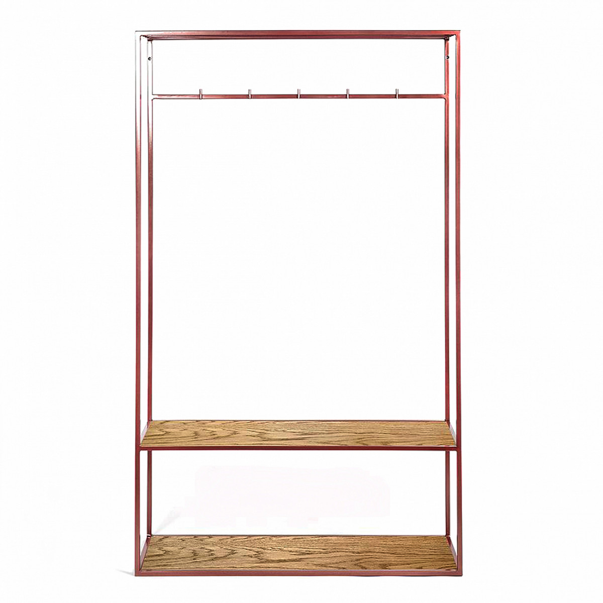 Модель оснащена двумя полками для хранения из натурального дерева, металлическими крючками, а также полкой для аксессуаров, на которую можно вешать шарфы, ремни и плечики.