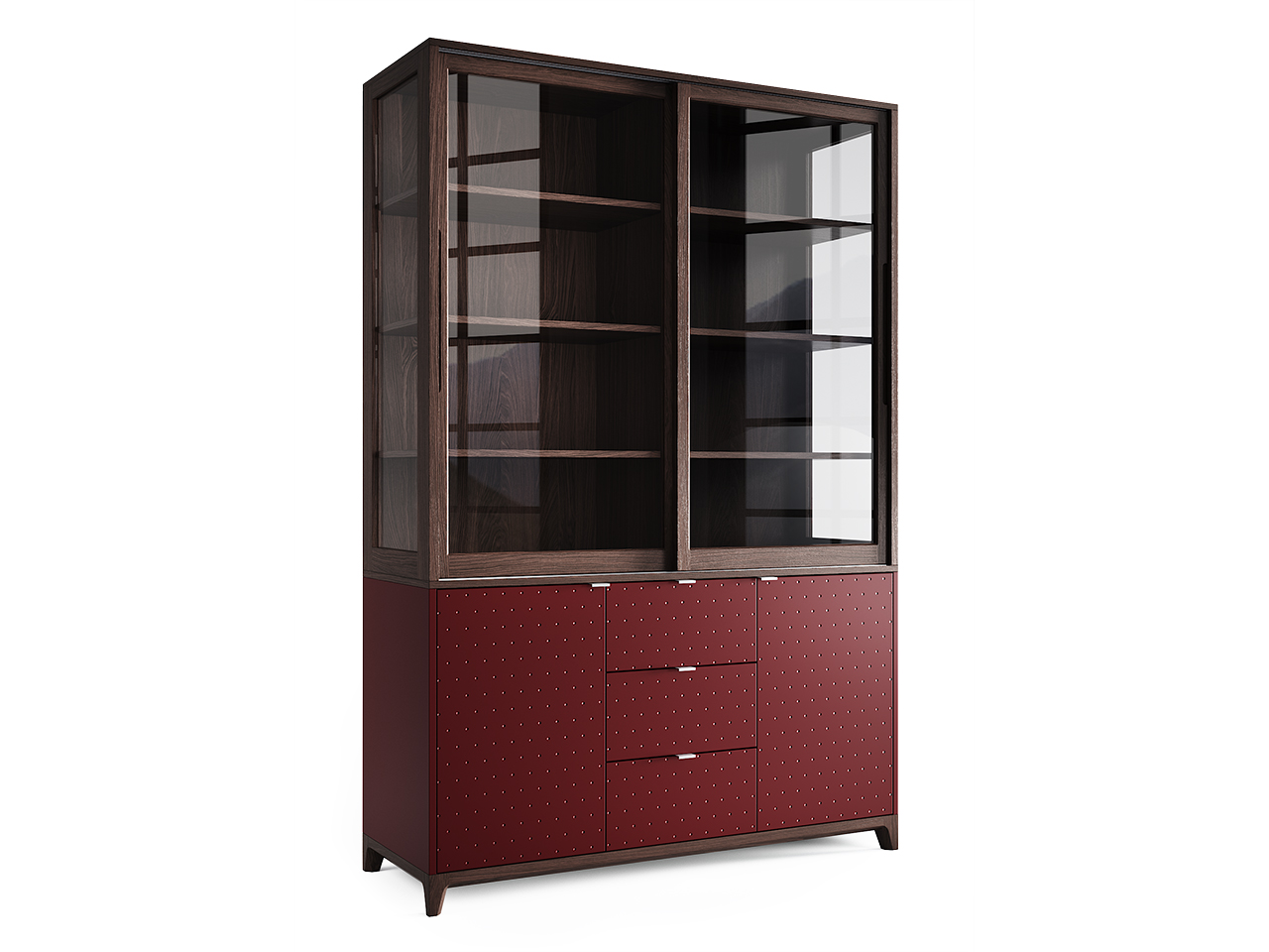 Стеклянные фасады буфета Case поддерживают визуальную легкость конструкции и создают удачное место для хранения памятных сувениров, книг и аксессуаров, позволяя рассмотреть детали и защищая содержимое от пыли. В нижней части буфета за фасадами с привлекательным узором скрываются вместительные полки и ящики.Особенности.Фасады верхней секции изготовлены из массива дуба.Итальянские направляющие в верхней секции с регулировкой уровня фасадов и доводчиками.Все детали наполнения верхней секции покрыты натуральным шпоном дуба.Нагрузка на каждую полку до 30 кг.Износостойкие каркасы ящиков из ЛДСП.Европейская фурнитура с плавным ходом и доводчиками в нижней секции.Материалы.Основание – массив дуба.Корпус – МДФ, натуральный шпон дуба.Фасады – МДФ, массив дуба.Каркас верхней секции – массив дуба, МДФ, натуральный шпон дуба.Ящики, полки и перегородки нижней секции – ЛДСП, светло-серый.Фурнитура – петли с плавным закрыванием, направляющие с доводчиками, стальные крепежные элементы. Покрытие – тонировка, матовый лак, эмаль.Ручки – алюминий.