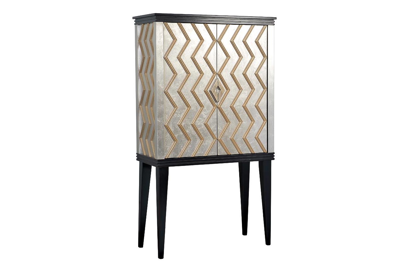 Дизайнерский барный шкаф ручной работы с геометрическим рисунком выполнен в духе биметаллической гостиной Форсайтов 10-х годов прошлого века. Фасад корпуса отделан тончайшей фольгой цвета старого золота и серебра и дополнительно прокрашен вручную по специальной технологии, тщательная отделка каждой детали придает ему особую индивидуальность. Три полки позволяют удобно разместить напитки в соответствии с классификацией. Шкаф прекрасно впишется в интерьер в стиле арт-деко, богемный шик или фьюжн, добавляя артистизма и буржуазного лоска в обстановку. У нас вы можете приобрести вместительный комод и TV-тумбу с роскошными столешницами из натурального камня арт. ART-1973-S и арт. ART-1973-TV из этой же коллекции, чтобы меблировать гостиную или столовую в едином стиле.