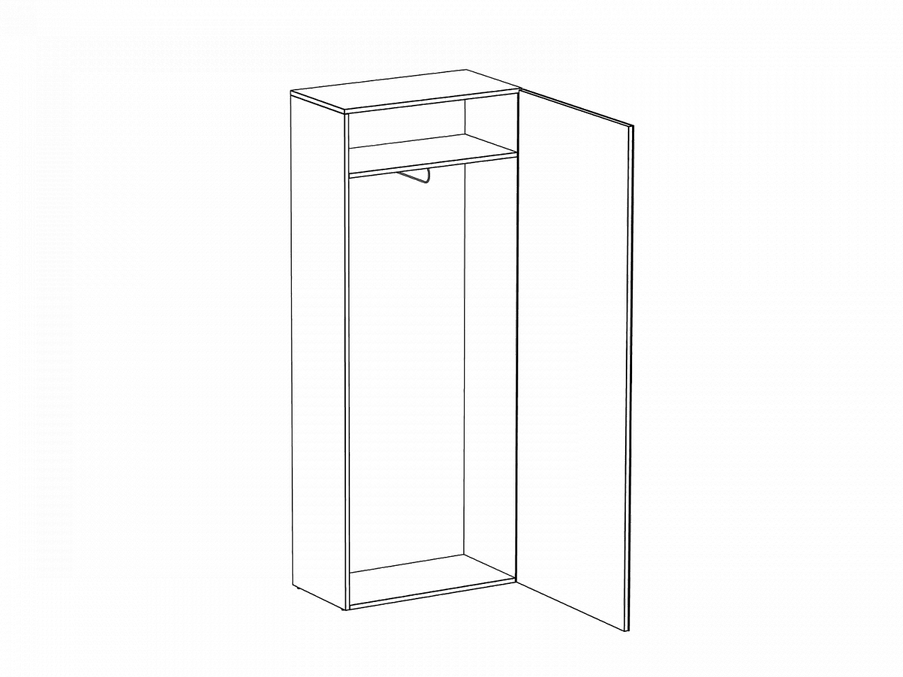 Шкаф имеет два отделения. Верхняя стационарная полка образует отделение для хранения головных уборов. В нижнем отделении установлена выдвижная штанга для хранения верхней одежды. Распашная дверь открывается по принципу «нажал-открыл». Задняя стенка белог...