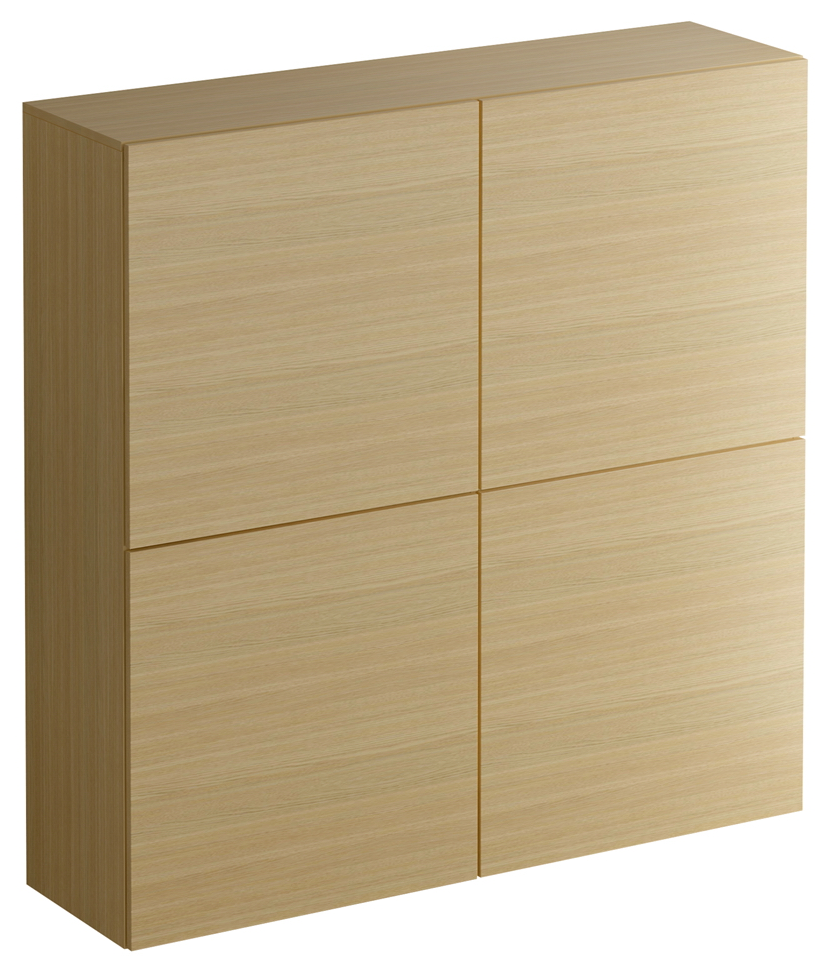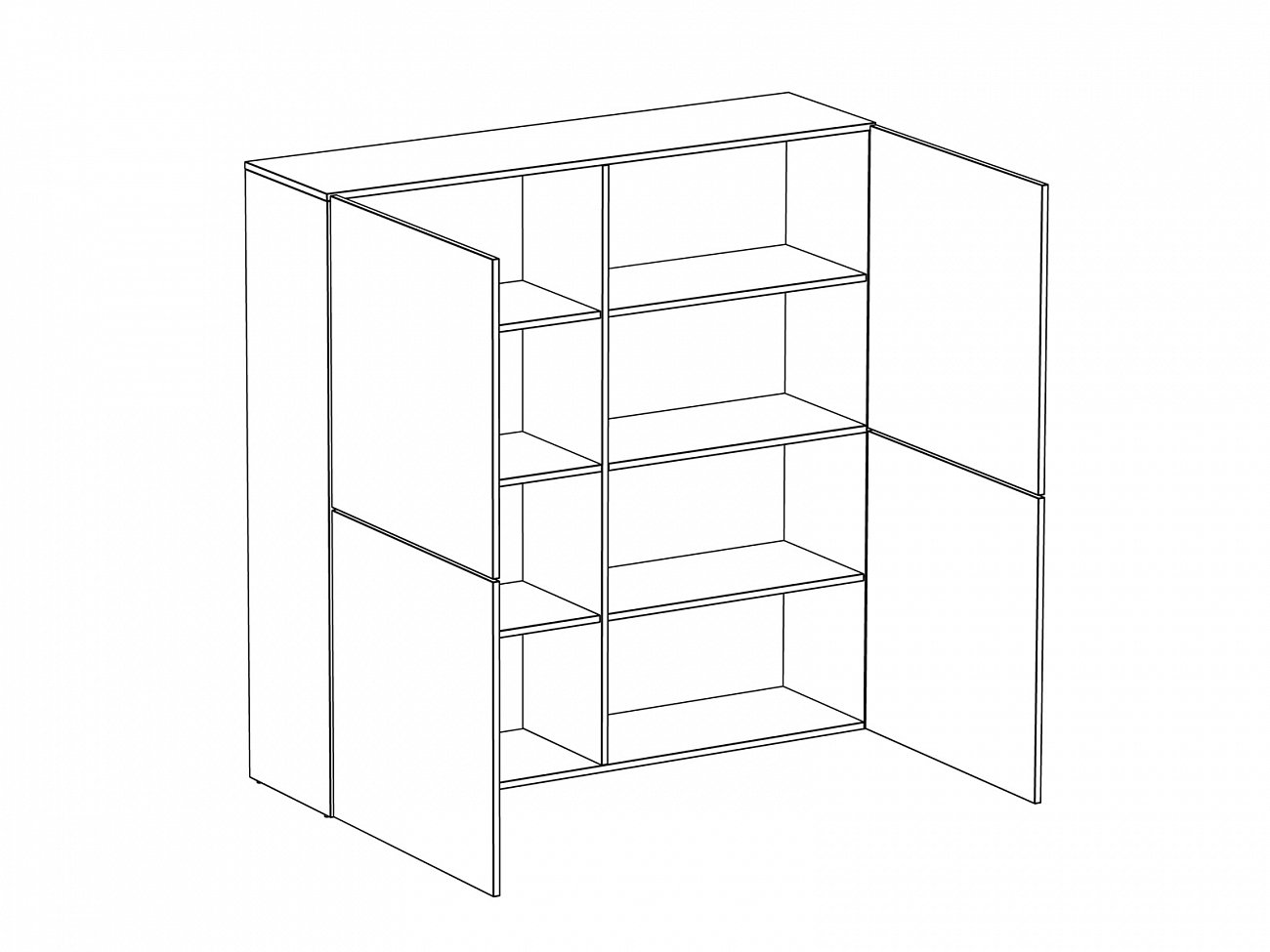 Фасад шкафа состоит из четырех распашных дверей, открывающихся по принципу «нажал-открыл». Шкаф имеет четыре отделения, в каждом отделении расположена съемная полка с возможностью переустановки по высоте. Задняя стенка белого цвета.