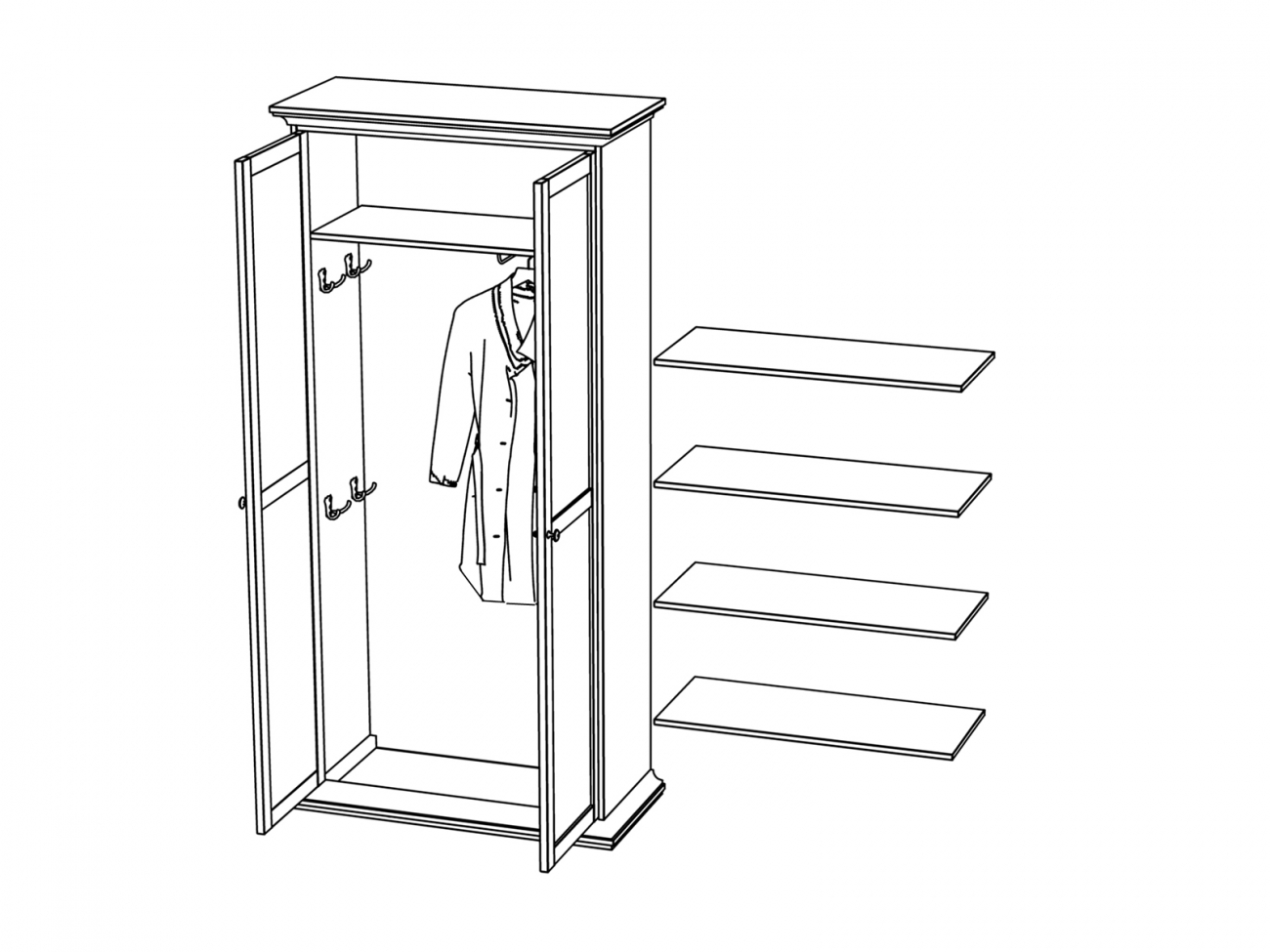Шкаф с двумя распашными дверцами. В верхней части шкафа расположена стационарная полка, в правой части выдвижная штанга для одежды, слева находятся 4 крючка для сумок. Шкаф крепится к стене. Опционально может быть доукомплектован четырьмя съемными полками за дополнительную плату.