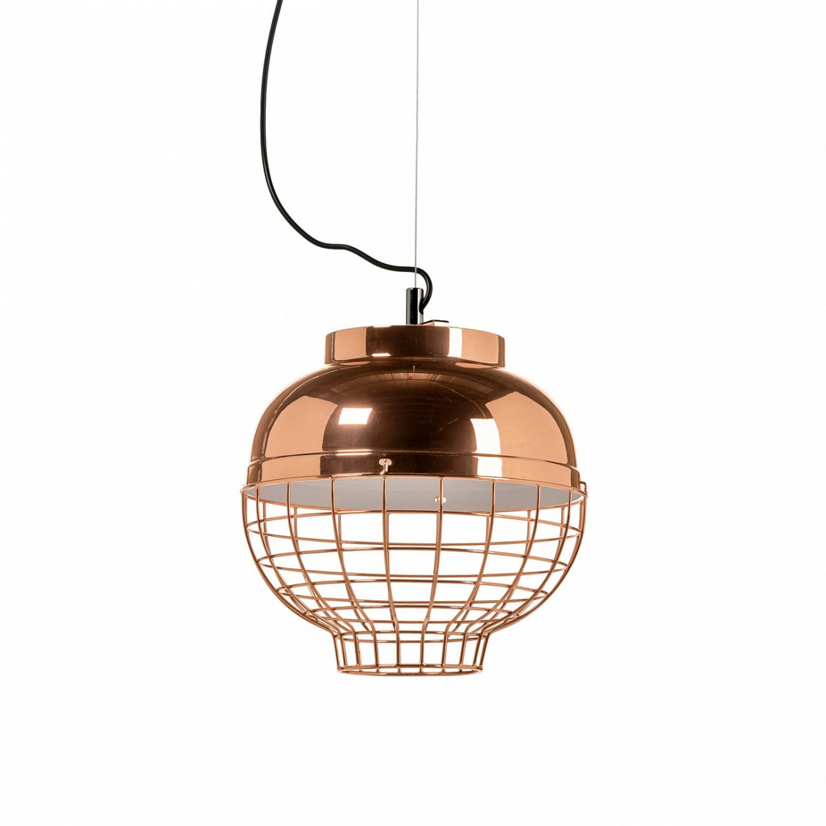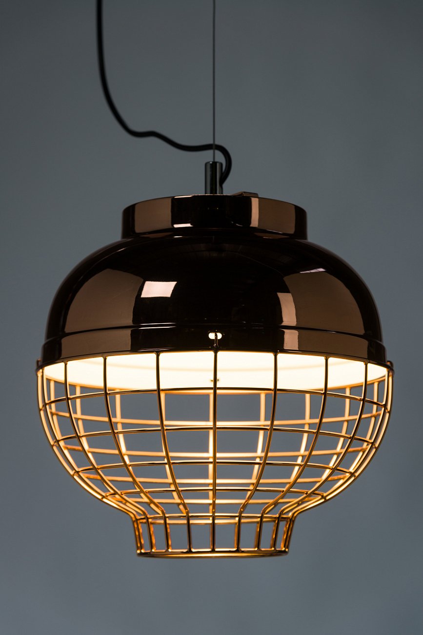 Название светильника можно перевести как «ослепительный блеск» — металлический абажур и правда ослепляет своим сиянием. Оформление в цвете «розовое золото» еще больше усиливает этот эффект. Необычный декор в виде клетки и яркое цветовое оформление уравновешиваются симметрией формы и строгостью линий. Все вместе создает образ некоего технологичного солнца и напоминает яркие ретросветильники 60-х.