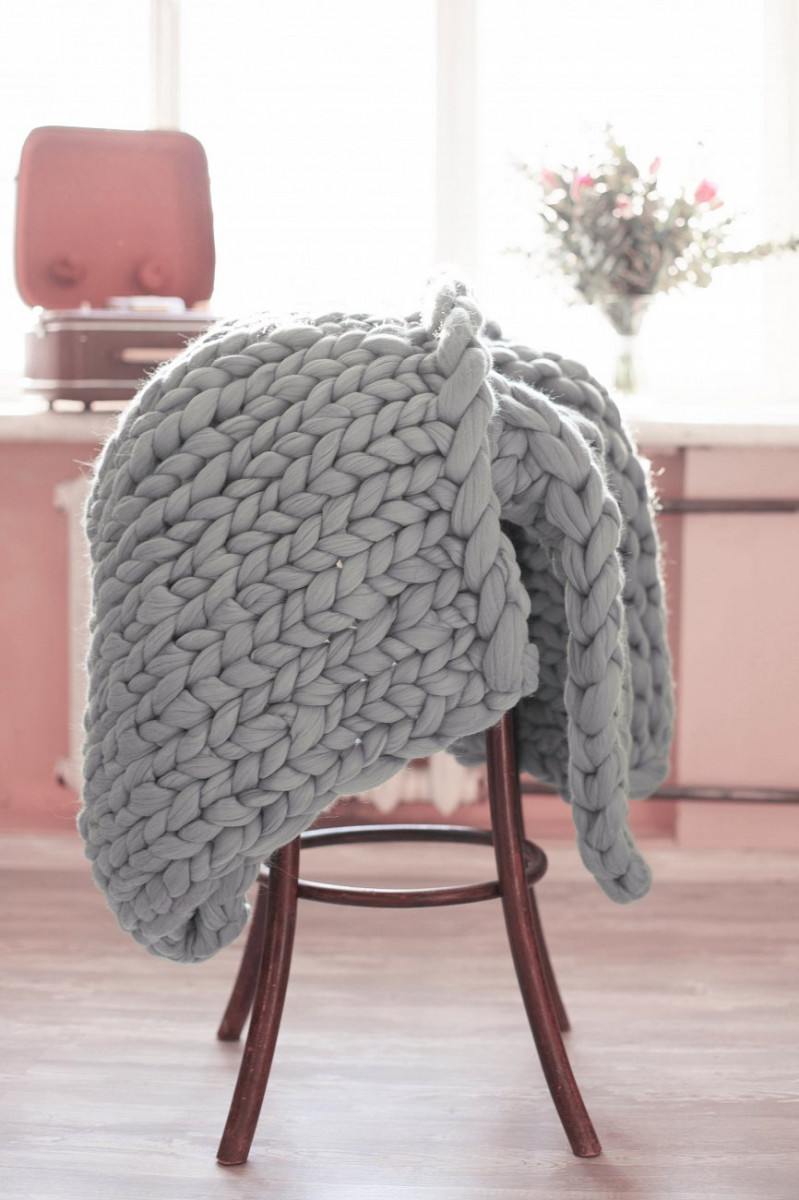 Плед крупной вязки изготовлен вручную из толстой пряжи, что делает изделие уникальным с эстетической точки зрения. Такой декор впишется в любой стиль интерьера.