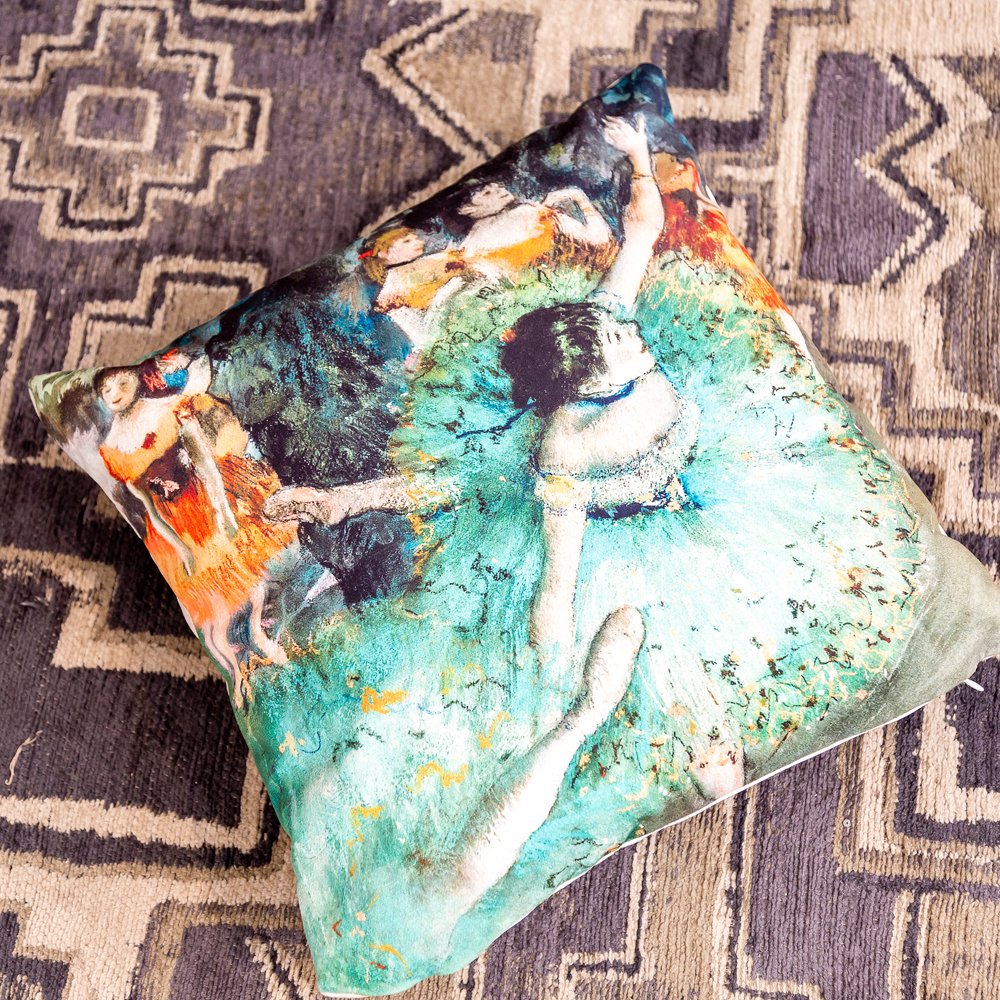 Превратить собственный интерьер в событие Вам помогут неожиданные экстравагантные образы и яркие краски импрессионизма, оживляющие обстановку энергичным настроением и интригующим сюжетом. К тому же, дизайн цитирует мировую классику живописи, престиж которой польстит любому, даже самому изысканному интерьеру. Подушка великолепно передает бархатистую фактуру пастельных красок, непревзойденным мастером которых является Эдгар Дега. Пастель привлекала мастера благородством, чистотой и свежестью цвета, трепетной вибрацией штриха, живостью и прозрачностью. Все эти достоинства живо иллюстрирует картина «Балерины в зеленом», созданная в 1879 году.