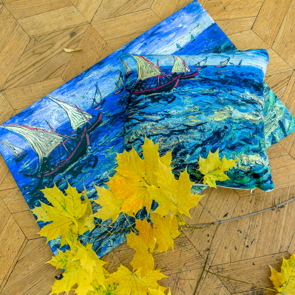 Импрессионизм - искусство воздушной живописи. Декоративные аксессуары, украшенные шедеврами импрессионизма, наполнят Ваш интерьер атмосферой свежести и света. Подушка раскрашена солнечным морским пейзажем, сошедшим с картины Винсента Ван Гога «Лодки в Сен-Мари», написанной в 1888 году.