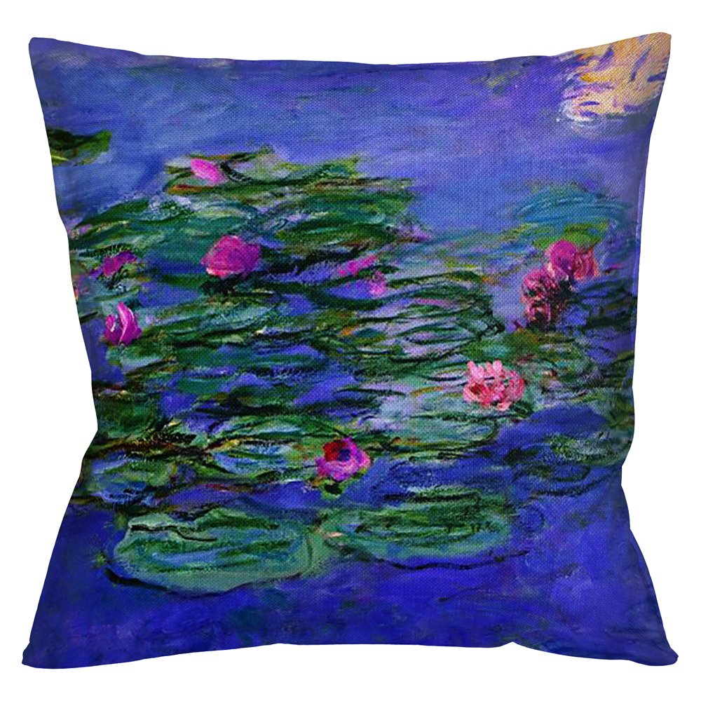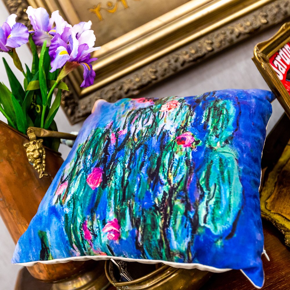 Интерьерный декор, доверивший импрессионизму, обретает яркость, свежесть и атмосферную легкость, - всё, чем славится импульсивная живопись импрессионистов. Подушка цитирует картину «Красные водяные лилии», написанную в 1919 году Клодом Моне. Картина отличается удивительной прозрачностью красок. Эффект акварели, достигнутый масляными красками, констатирует уникальный художественный дар автора. Атмосферный эффект импрессионизма растворяет в интерьере легкость и свежесть.