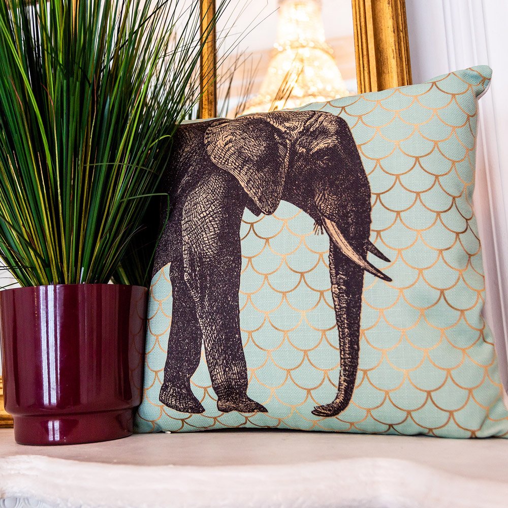 Фантазию рамками не ограничить. В дизайнерских интерьерах находится место и слонам, и жирафам, и экзотическим красавцам из семейства кошачьих. Фоновый орнамент на подушках нанесен краской, имитирующей золото. Игра различных оттенков желтого и бежевого цветов создает иллюзию блестящего орнамента.