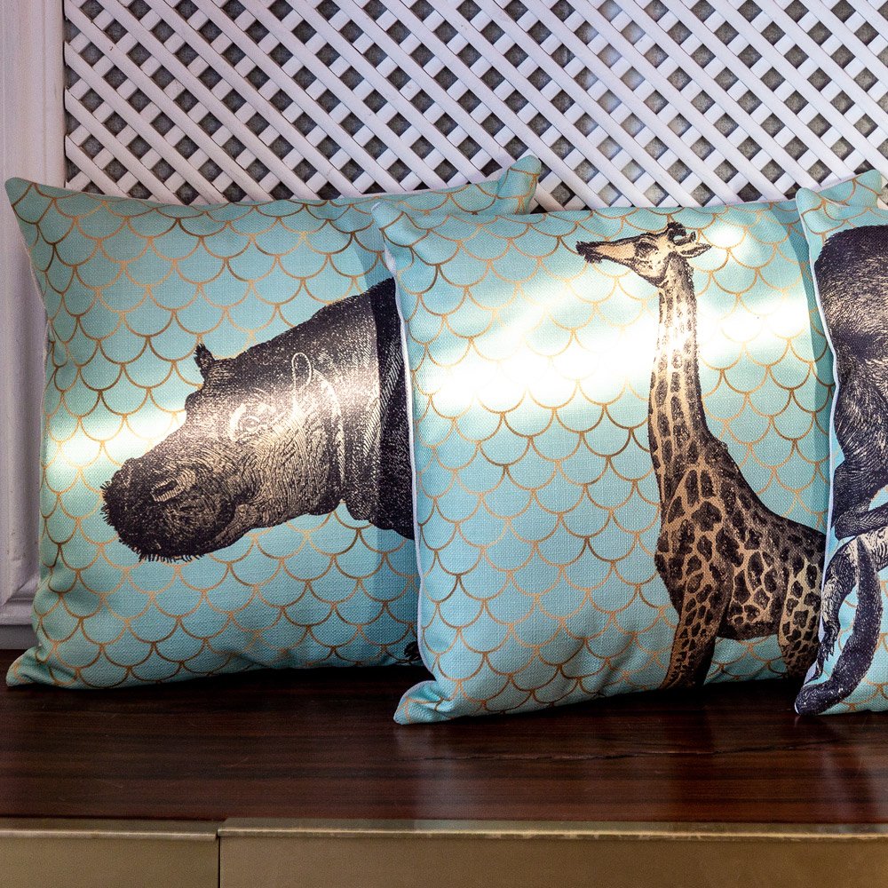 Использование анималистических принтов в интерьере изменяет его коренным образом, – скучное повседневное помещение преображается и становится зрелищным и живым. Фоновый орнамент на подушках нанесен краской, имитирующей золото. Игра различных оттенков желтого и бежевого цветов создает иллюзию блестящего орнамента.