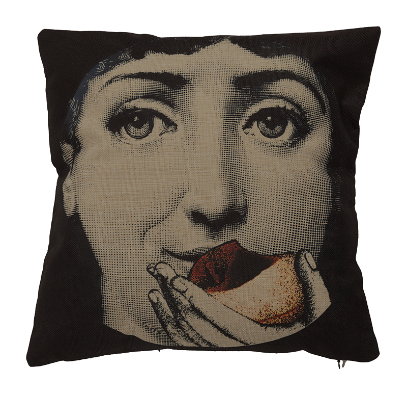 Портрет прекрасной Лины Кавальери на предметах декора — визитная карточка известного итальянского дизайнера Пьеро Форназетти Piero Fornasetti. Многочисленные эксперименты с ее внешностью — это отражение той почти юношеской влюбленности, которую питал к своей модели знаменитый итальянский дизайнер. На этом портрете она так аппетитно наслаждается вкусным фруктом! Эта подушка с очаровательной Линой станет эксклюзивным украшением вашего стильного интерьера или оригинальным подарком.