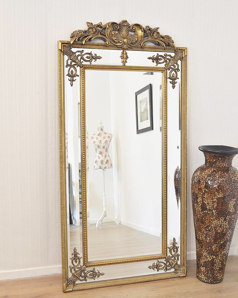 Это высокое, изящное и витиеватое напольное зеркало в раме цвета античное золото имеет четыре панели с фацетом и филигранным узором. Внутреннее зеркало окантовано орнаментом в виде бус. Прекрасный декор для интерьера в классическом стиле.